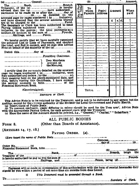 Article 18.—After each finance meeting of the council or board the secretary or clerk shall forthwith deliver or transmit by post to every person in whose favour a payment is ordered at the said meeting a paying order (Form 8) duly signed by him, provided that orders for payments authorised under Article 16 of this Order shall not be issued by the secretary or clerk prior to the day on which payment may be made as specified in the special advice note. | ||||||||||||||||||||||||||||||||||||||||||||||||||||||||||||||||||||||||||||||||||||||||||||||||||||||||||||||||||||||||||||||||||||||||||||||||||