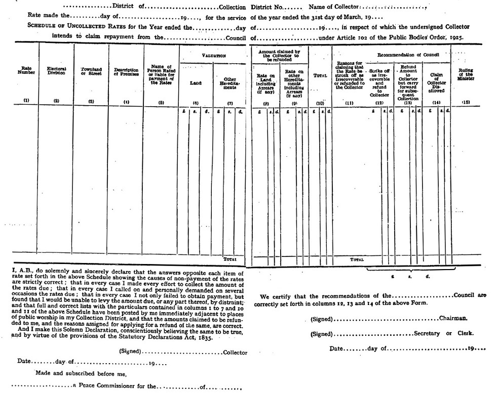 Article 37.—When the secretary or clerk has received from the Department of Local Government and Public Health a copy of the auditor's report and of the abstract, he shall lay the same before the council or board at their next meeting, and shall forthwith after such meeting, in lieu of the publication of the abstract of accounts directed to be published by Section 18 of the Local Government (Ireland) Act, 1871, publish a notice (Form 15), in some one or more of the public newspapers circulating throughout the county or district ; and shall furnish without charge to the proprietor or editor of any newspaper who may apply for the same, and to each member of the council or board, a copy of the auditor's report and a copy of the abstract ; he shall also furnish a copy of the report and abstract to any person who applies for the same and pays therefor to the council or board the sum of sixpence. | ||||||||||||||||||||||||||||||||||||||||||||||||||||||||||||||||||||||||||||||||||||||||||||||||||||||||||||||||||||||||||||||||||||||||||||||||||