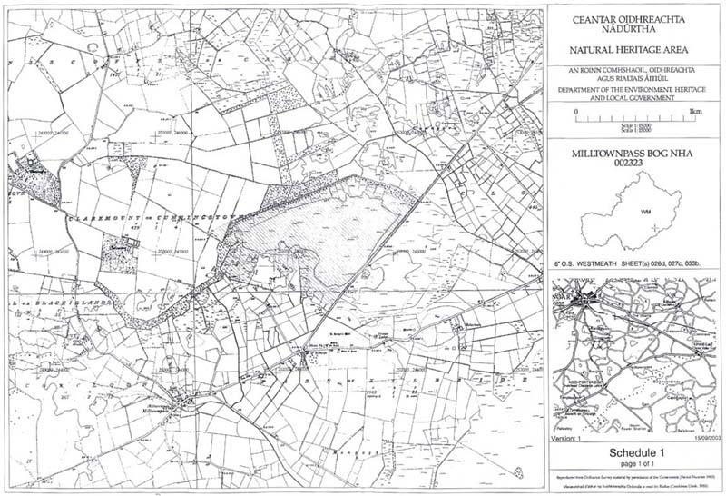 3.        The area of land comprising that part of Milltowpass Bog in the townlands of Claremount Or Cummingstown, Corcloon, Enniscoffey Or Caran, Milltown (Fartullagh By and Pass Of Kilbride in the County of Westmeath (being the land enclosed on the map (contained in Schedule 1 to this Order) within the inner margin of the green line and hatched thereon in green) is designated a natural heritage area.