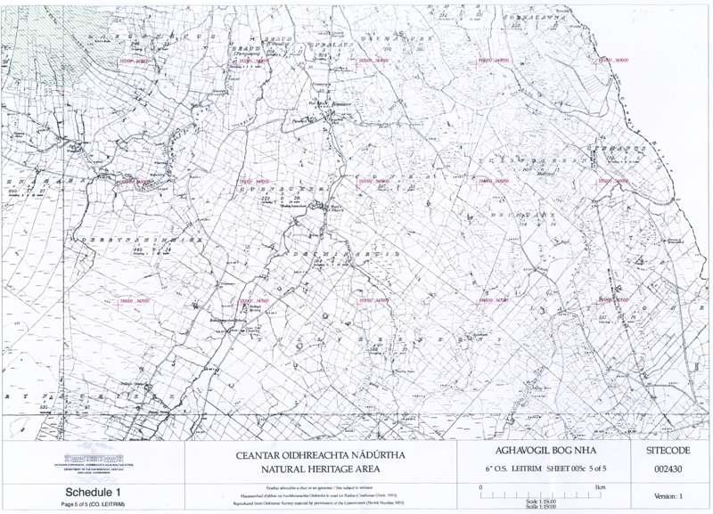 3.        The area of land comprising that part of Aghavogil Bog in the townlands of Aghavoghil, Aghnahaha, Ardagh (Gilbride), Ardagh (Sheeran), Buckode, Carrowboy Carrowkeel, Cloghan, Conwal North, Drungan, Glack, Larganhugh, Lissiniska, Mautiagh Moher (Rosclogher By), Mollynadinta, Mullanavockaun, Shasgar and Tawnaleck in the County of Leitrim (being the land enclosed on the map (contained in Schedule 1 to this Order) within the inner margin of the green line and hatched thereon in green) is designated a natural heritage area.