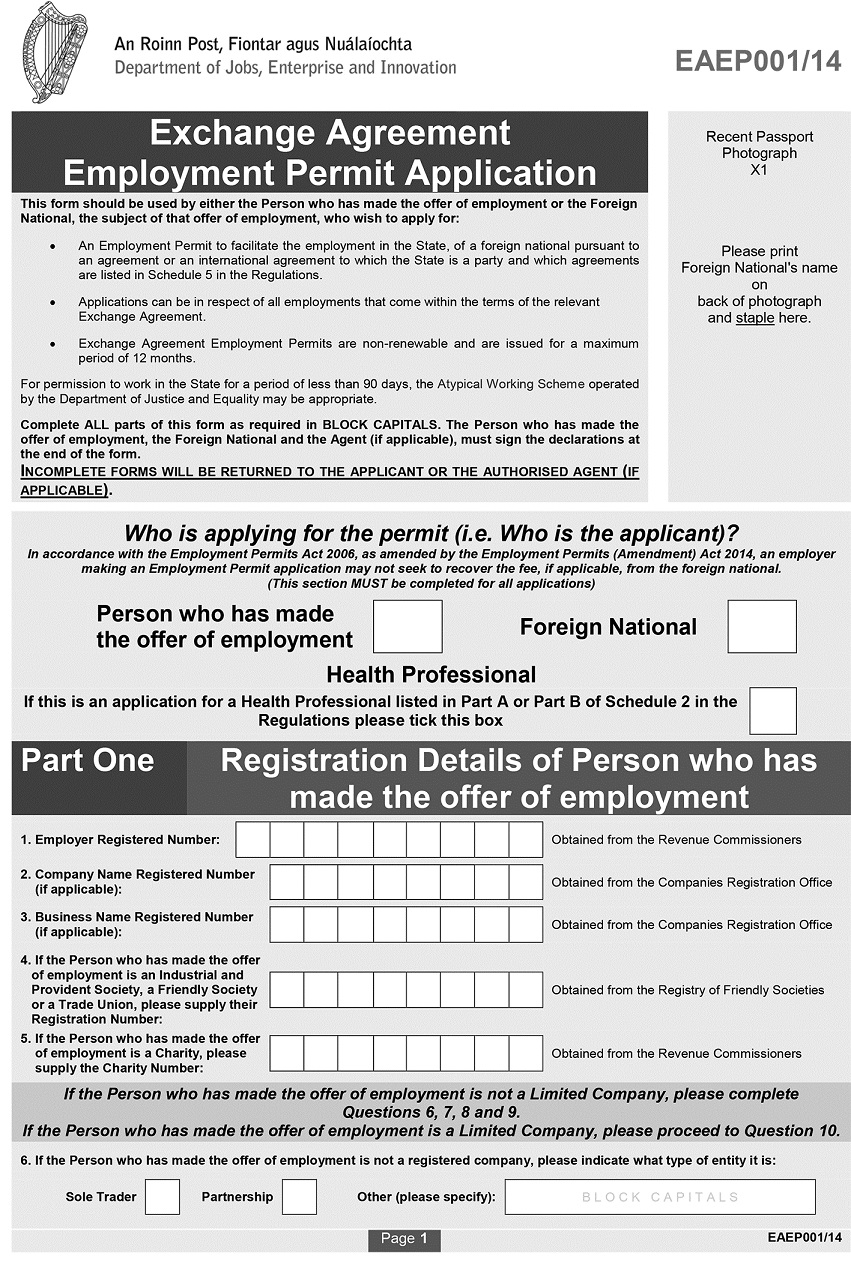 Application form for grant of Exchange Agreement Employment Permit | ||