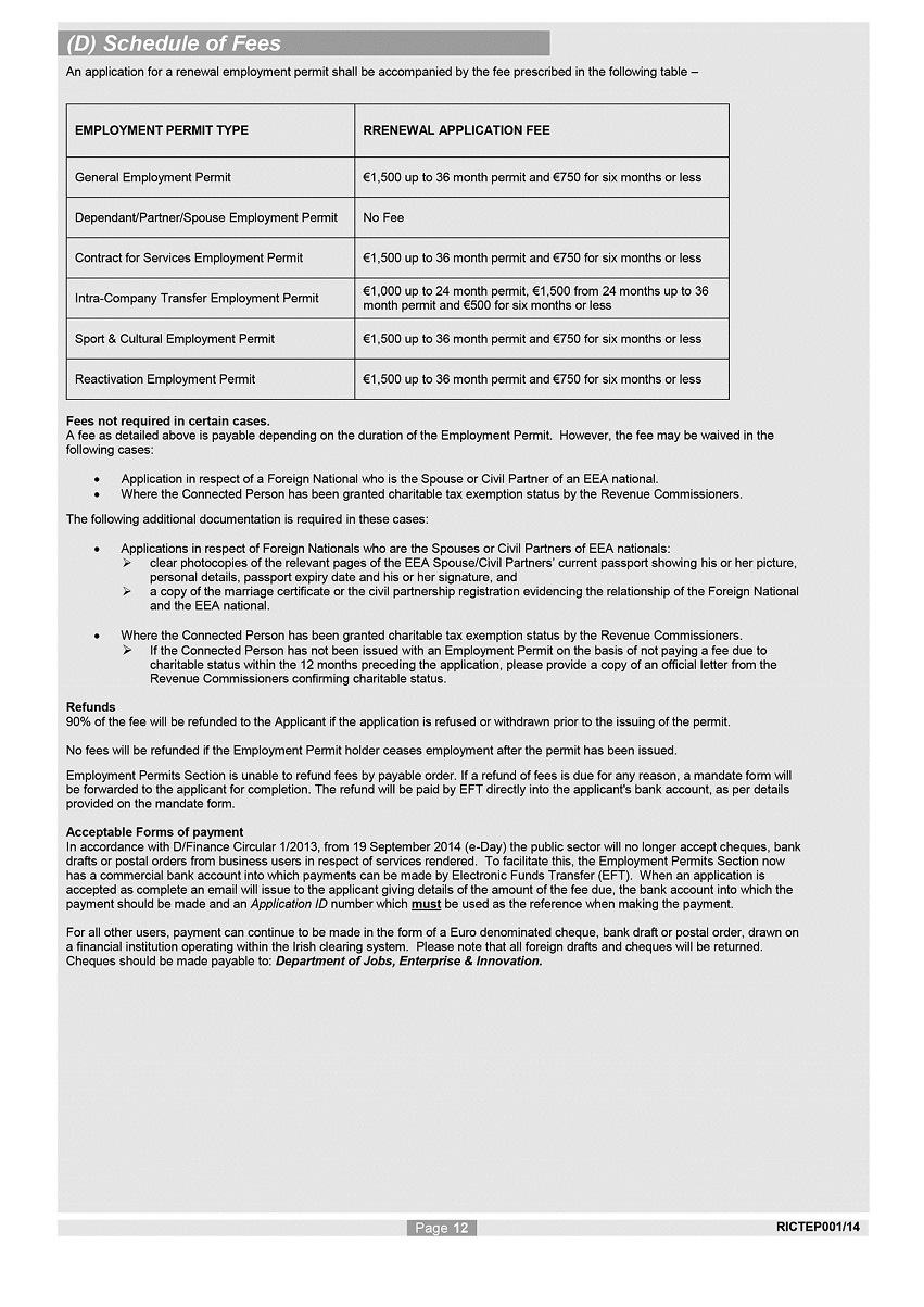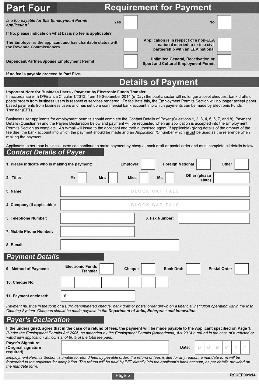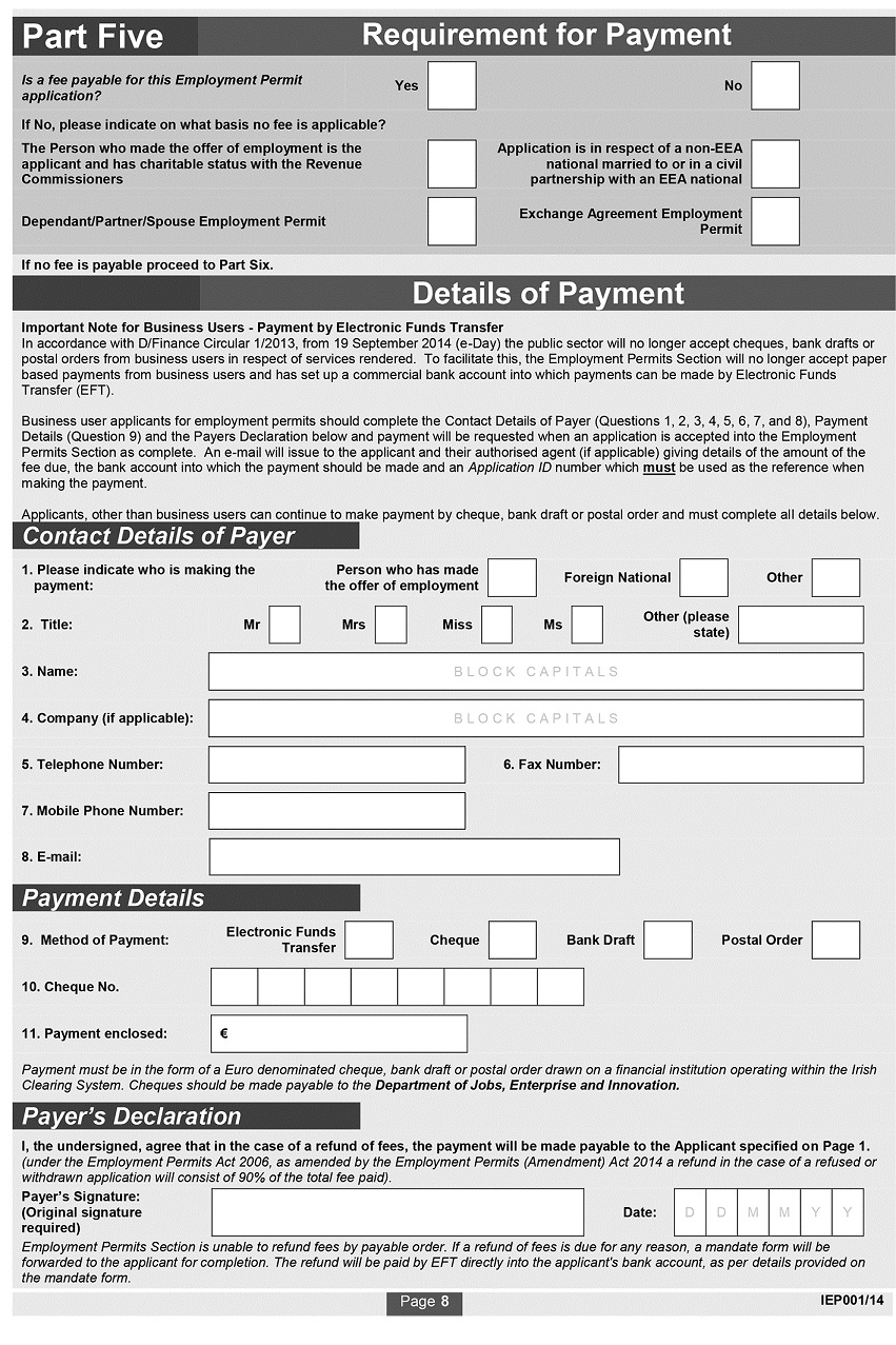 (2) Payment of fees under these Regulations and the Principal Act shall be made in the form of a Euro denominated cheque, bank draft, demand draft or postal order, drawn on a financial institution operating within the Irish clearing system and made payable to the Department of Jobs, Enterprise and Innovation, or by electronic transfer to an account of the Department of Jobs, Enterprise and Innovation, specified from time to time for this purpose by the Minister. | ||