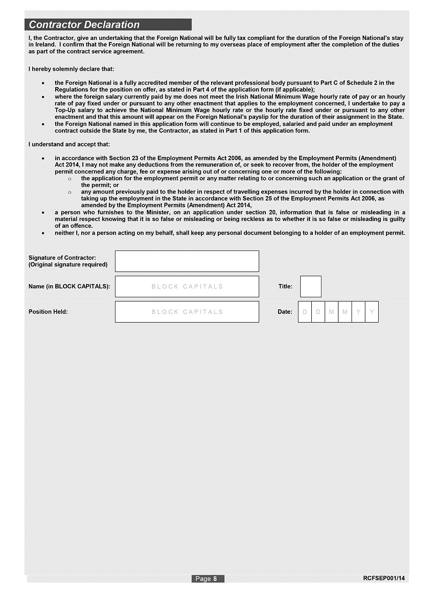 (d) where the person who makes the offer of employment, or, as the case may be, the contractor or connected person, has not yet made returns to the Revenue Commissioners in respect of employees, a statement in writing provided by the Revenue Commissioners confirming registration with the Revenue Commissioners and stating the said person’s ERN (Employer Registered Number), | ||