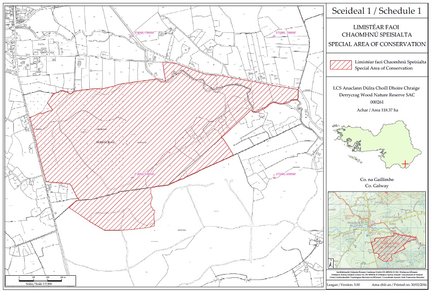 The area known as Derrycrag Wood Nature Reserve Special Area of Conservation 000261 is situated in the county of Galway being the land and waters enclosed on the map (contained in Schedule 1) within the inner margin of the red line and hatched in red and is situated in whole or in part in the townlands of Bolag, Clonco, Derrycrag, Derrygill and Woodford. | ||