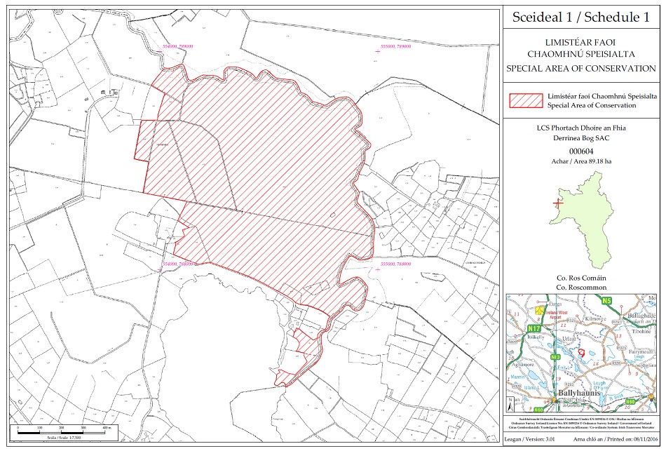 The area known as Derrinea Bog Special Area of Conservation 000604 is situated in the county of Roscommon being the land and waters enclosed on the map (contained in Schedule 1) within the inner margin of the red line and hatched in red and is situated in whole or in part in the townlands of Cloonacolly, Cloonagh (E.D. Artagh South), Corracommeen, Derrinea and Errit. | ||