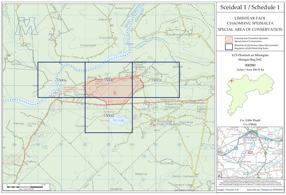 The area known as Mongan Bog Special Area of Conservation 000580 is situated in the county of Offaly being the land and waters enclosed on the map (contained in Schedule 1) within the inner margin of the red line and hatched in red and is situated in whole or in part in the townlands of Clonascra, Clonfinlough, Clonmacnoise and Tullaghbeg. | ||