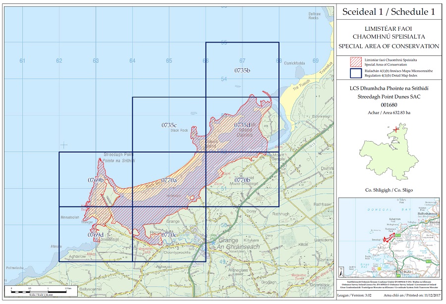 The area known as Streedagh Point Dunes Special Area of Conservation 001680 is situated in the county of Sligo being the land and waters enclosed on the map (contained in Schedule 1) within the inner margin of the red line and hatched in red and is situated in whole or in part in the townlands of Cloontyprocklis, Conors Island, Dernish Island, Grange, Moneygold, Mount Temple and Streedagh. | ||