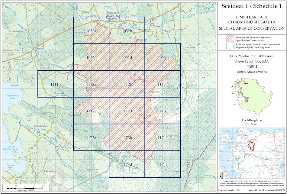 The area known as Slieve Fyagh Bog Special Area of Conservation 000542 is situated in the county of Mayo being the land and waters enclosed on the map (contained in Schedule 1) within the inner margin of the red line and hatched in red and is situated in whole or in part in the townlands of An Léana Riabhach, Barr Rúscaí, Béal an Ghoile Theas, Gleann Toirc Beag, Gleann Toirc Mór, Glencullin Upper, Moing Iongáin, Sheskin and Sraith na Pláighe. | ||||||||||||||||||||||||||||||||||||||||||||