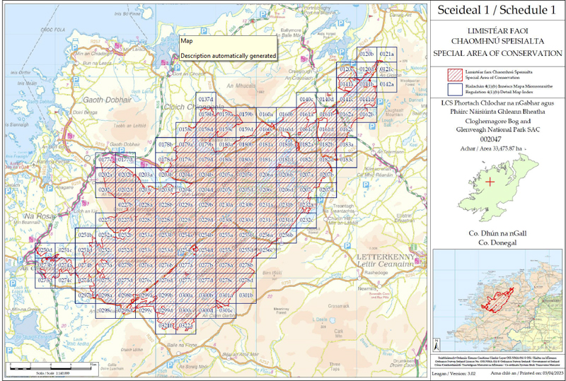 The area known as Cloghernagore Bog and Glenveagh National Park Special Area of Conservation 002047 is situated in the county of Donegal being the land and waters enclosed on the map (contained in Schedule 1) within the inner margin of the red line and hatched in red and is situated in whole or in part in the townlands of Allt na dTadhg, Alltán, An Airdmhín, An Bearnas Uachtarach, An Chloigeann Thuaidh, An Chúlbhá, An Cionn Garbh, An Coimín [T: An Dúchoraidh], An Dún Mór [T: Na Croisbhealaí], An Mhín Mhór, An Mhín Mhór Thoir, An Srath Greadaithe, An Srath Mór, An Srath Mór Uachtarach, An tArd Donn, An Teanga Mheáin [T: Cró Bheithe], An Tor, Ard an Chrainn, Ardaturr, Ardaturr Mountain, Baile Bun an Abair, Barr Dhroim na Tine, Béal an Atha Buí, Beifleacht, Brockagh (E.D. Creenasmear), Bun na dTrí Sruthán, Caiseal na gCorr, Carraig an Tiompáin, Carrowtrasna (E.D. Gartan), Cashel (E.D. Doe Castle), Casheltown (E.D. Gartan), Casheltown Mountain, Churchtown (E.D. Gartan), Claggan Mountain, Claggan Mountain South, Clochar na nGabhar, Cnoc an Stualaire, Craig (E.D. Creeslough), Crathaigh [T: An Clochán Liath], Críonaire, Cró an Locháin, Cró Bheithe, Cró na gCaorach, Cró na Sealg, Croich Uí Bhaoill, Croithlí, Derriscligh, Derrybeg (E.D. Gartan), Derrylahan (E.D. Cross Roads), Devlin, Doire Fada, Doire Leac Chonaill Thuaidh, Doire na Coradh, Doire na nAspal, Doire na nGrial, Droim Liafala, Droim Miasan, Droim na Coilleadh, Droim na Coradh [T: An Craoslach], Droim na hAtha [T: Gleann Léithín], Droim na Rátha, Droim na Searrach, Drumlackagh, Drumnalifferny, Duibhlinn nó Barr Bhaile Chonaill, Dún Lúiche Iochtarach, Dún Lúiche Uachtarach, Eadarbhaile, Gartan Mountain, Garvary (E.D. Creeslough), Garvary Mountain, Glasán, Gleann Domhain Beag, Gleann na mBuachaill, Gleann Tornáin, Glenbeagh, Glengillagrana High, Glenieraragh, Glenineeny, Glenmenagh, Kill (E.D. Carrickart), Lacknacoo, Loch Achair, Loch Beara nó An Cruaichín, Losset, Maghernashangan, Maigh Ráithe, Meenbunone, Meenlaragh (E.D. Glen), Mín an Chuilinn, Mín an Duáin, Mín an tSionnaigh, Mín Corrbhaic, Mín Doire Thoirc, Mín na bPoll [T: Suí Corr], Mín na gCopóg, Muine Beag, Muine Mór, Mullangore, Na Beanna Gorma, Na Brocacha [T: Cró Bheithe], Na hAgalla, Na Polláin Dhubha, Prochlais [T: Dún Lúiche], Roosky (E.D. Creeslough), Roshin (E.D. Gartan), Seascann an Róin, Skeagh, Sliabh Bhaile an Easa, Sliabh Bhaile na Bh, Sliabh Dhroim na Luifearnaí, Sliabh na Bealtaine, Sliabh na Cloigne Thuaidh, Srath na Sagart, Sruhangarrow, Sruhangarrow Mountain, Staghall, Staghall Mountain, Staghall Mountain East, Tulacha Beigile Thiar, Tulacha Beigile Thoir, Ucht Mín, Warrentown, Warrentown Mountain South and Whitehill (E.D. Gartan). | ||||||||||||||||||||||||||||||||||||||||||||||||||||