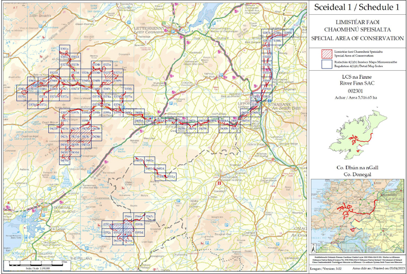 The area known as River Finn Special Area of Conservation 002301 is situated in the county of Donegal being the land and waters enclosed on the map (contained in Schedule 1) within the inner margin of the red line and hatched in red and is situated in whole or in part in the townlands of Aghaveagh, Ailt an tSneachta, Altnapaste, An Ailt Leathan, An Bheathaidh Mhór, An Bhinn Dubh, An Bhinn Mhór, An Bhrocaigh [T: An Clochán], An Chluain Chlaíoch, An Chomairce, An Cionn Garbh, An Clochán Beag, An Clochar Thoir, An Coimín [T: An Clochán], An Cró Cam, An Curraoin, An Dearachán Beag, An Dearachán Mór, An Deargchruach, An Fál Garbh, An Ghallbhuaile [T: An Clochán], An Gharbháin, An Ghlaiseach Bheag, An Ghlaiseach Mhór, An Liuchmhín, An Mhín Mhór Thoir, An Sruthán Garbh, An Sruthán Giobach [T: Allt na Péiste], An Taobh Díomhaoin, An Tóin Dubh [Thompson], An Tóin Dubh [T: Allt na Péiste], Ard Bata, Ardnagannagh, Avaltygort, Baile na Finne, Baile na mBan [T: An Clochán], Baile Uí Chiaragáin, Ballyarrell, Ballybobaneen, Ballybofey, Ballybogan, Ballybotemple, Ballylast, Ballymacavany, Ballynatone, Béal an Atha Móir, Buailte Pádraig, Cappry, Cark, Carn (E.D. Gleneely), Carn (E.D. Pettigoe), Carraig an Langáin, Carraig Mhathúna, Carranadore, Carrick (E.D. Killygordon), Carrickmore, Carricknamanna, Carrickshandrum, Carrigans, Castlefinn, Cavan Lower, Cavanaweery, Churchtown (E.D. Clonleigh South), Cill Ráin, Cloghan More, Cloghervaddy, Cloghfin (E.D. Castlefin), Cloghfin (E.D. Killea), Coneyburrow, Coolatee, Coolyslin, Corcam, Corkan Isle, Corlacky, Corraine, Creggan (E.D. Stranolar), Cró na Ceithirne, Cró na Doinne, Croaghbrack, Crocknacunny, Cronamuck, Cruach Leac, Cruach Mhín an Fheannta, Culliagh, Curraghalane, Curraghomongan, Cuttymanhill, Demesne, Donaghmore Glebe, Dooish (E.D. Dooish), Dreenan, Droim Dhoire Dhúnáin, Dromore (E.D. Gleneely), Drumbane, Drumboe Lower, Druminaw, Drummurphy, Drumnashear, Dúchruach, Dundee, Dungorman, Dunmore (E.D. Killea), Dunnaloob, Edenmore (E.D. Gleneely), Edergole (E.D. Lougheask), Foyfin, Garrisonhill, Glaisigh Daibhéid, Glasmullan (E.D. Killea), Glebe (E.D. Cloghan), Glebe (E.D. Stranolar), Glenfad, Gortiness, Grahamsland, Haw (E.D. Clonleigh South), Ironworks, Island More, Island More (part of), Kilcaddan, Killygordon, Kilnpark, Kiltown, Kiltyfergal, Kinnaderry, Leitir Bric, Lettershanbo (E.D. Cloghan), Lifford, Liscooly, Loch Muc, Loch na mBradán, Lorg na Lorcán, Magherareagh, Magherycallaghan, Maymore Lower, Maymore Upper, Meenagolan (E.D. Gleneely), Meenagrauv (E.D. Altnapaste), Meenahorna, Meenanamph, Meenanellison, Meenbog (E.D. Cloghan), Meenbog (E.D. Goland), Meenlougher, Meenreagh (E.D. Gleneely), Meentygrannagh, Mín an Arbhair, Mín an Chait, Mín an Ghriobaigh, Mín an Laig, Mín an tSamhaidh, Mín an tSionnaigh, Mín Ghiolla Charraigh [T: An Clochán], Mín na Gualanna [T: Baile na Finne], Mín na Manrach, Mín na Sróna Theas, Mín na Sróna Thuaidh, Mínte Meáin, Mínte Murgail, Mongavlin, Mullanboy, Mullandrait, Na Polláin Dhubha, Navenny, Oughtcarn, Portcreevy, Porthall, Portinure, Roughan (E.D. Clonleigh South), Seadavog Mountain, Srath an Ghallaigh, Srath na Bratóige, Srath na gCopóg, St Johnstown, Station Island, Stranamuck, Stranorlar, Taobh Riach, Taughboy, Tawnacrom, Tawnawully Mountains, Tievecloghoge, Tievetooey, Tirinisk, Tooslenagh, Townparks (E.D. Clonleigh South), Treanamullin, Trusk, Tullyowen, Tullytrasna (E.D. Cloghan), Unshinagh Lower, Welchtown, Whitehouse, Wood and Wood Island. | ||||||||||||||||||||||||||||||||||||||||||||||||